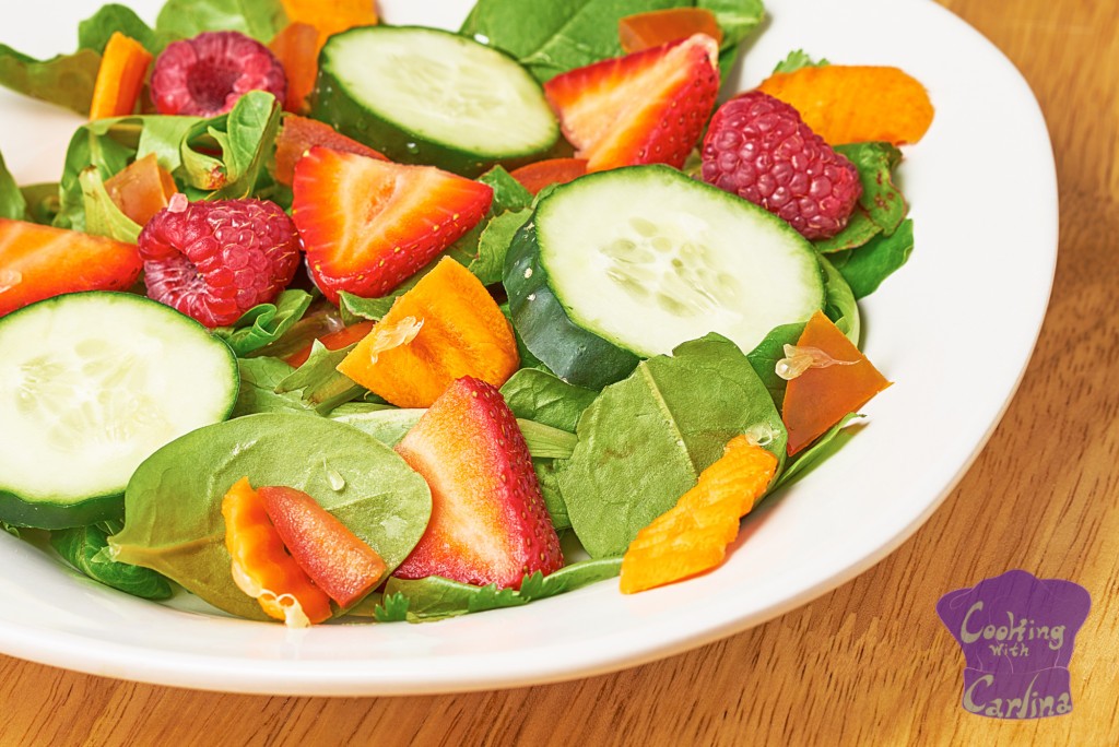- Toss the green salad, strawberries, raspberries, cucumber and carrots together in a bowl.